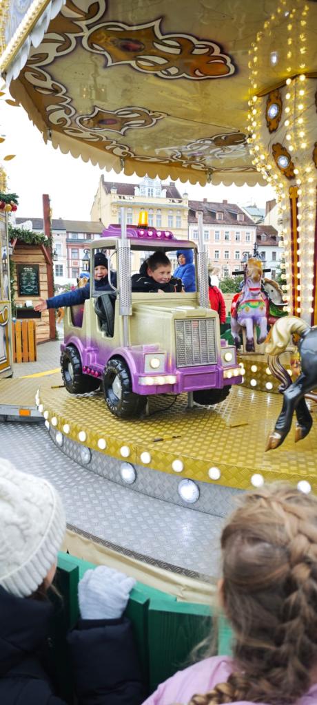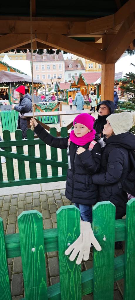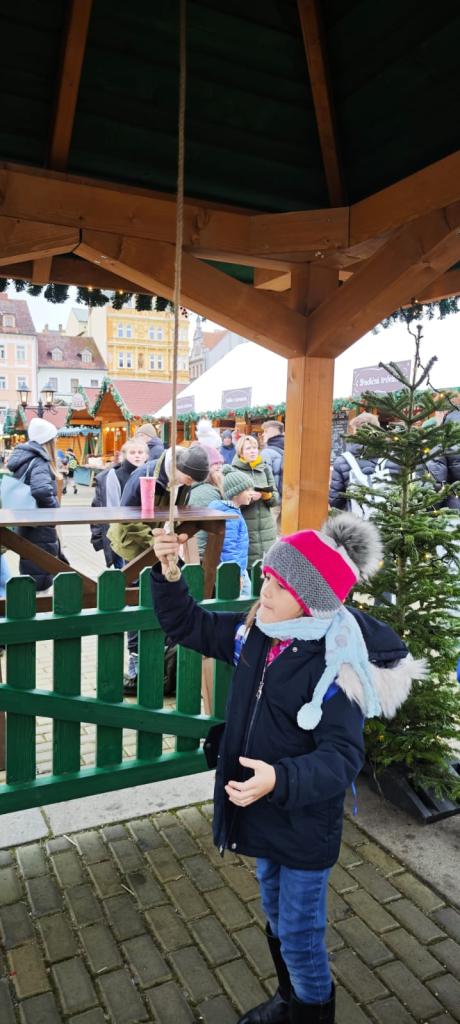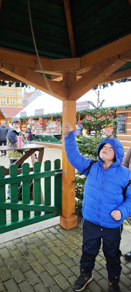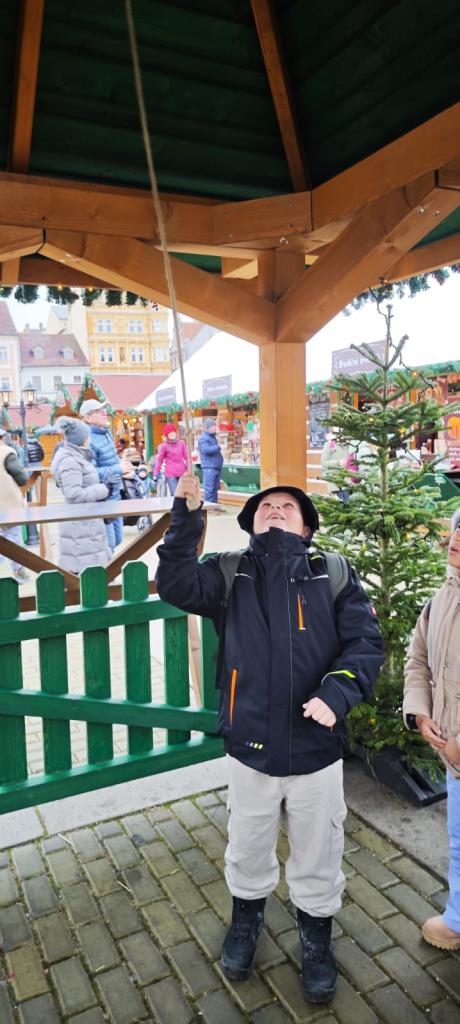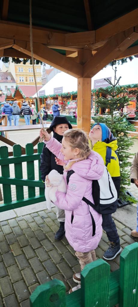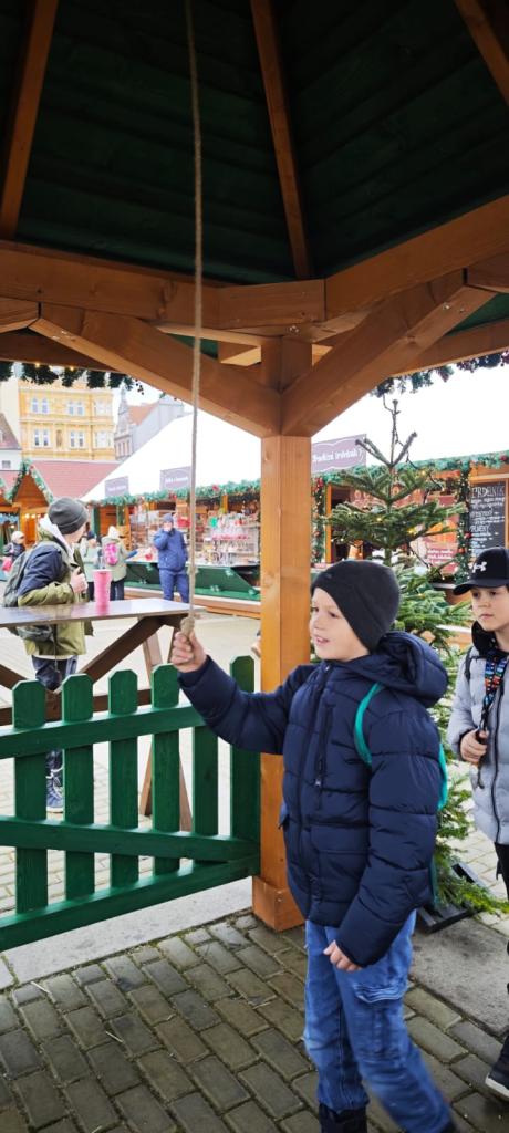 Poté se třída přesunula na vánoční trhy na náměstí, kde děti obdivovaly zdobené stánky, poslechly si koledy, ochutnaly trdelník, svezly se na kolotoči a sledovaly předvánoční ruch města.