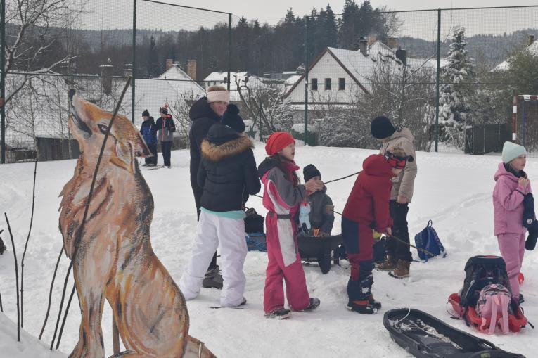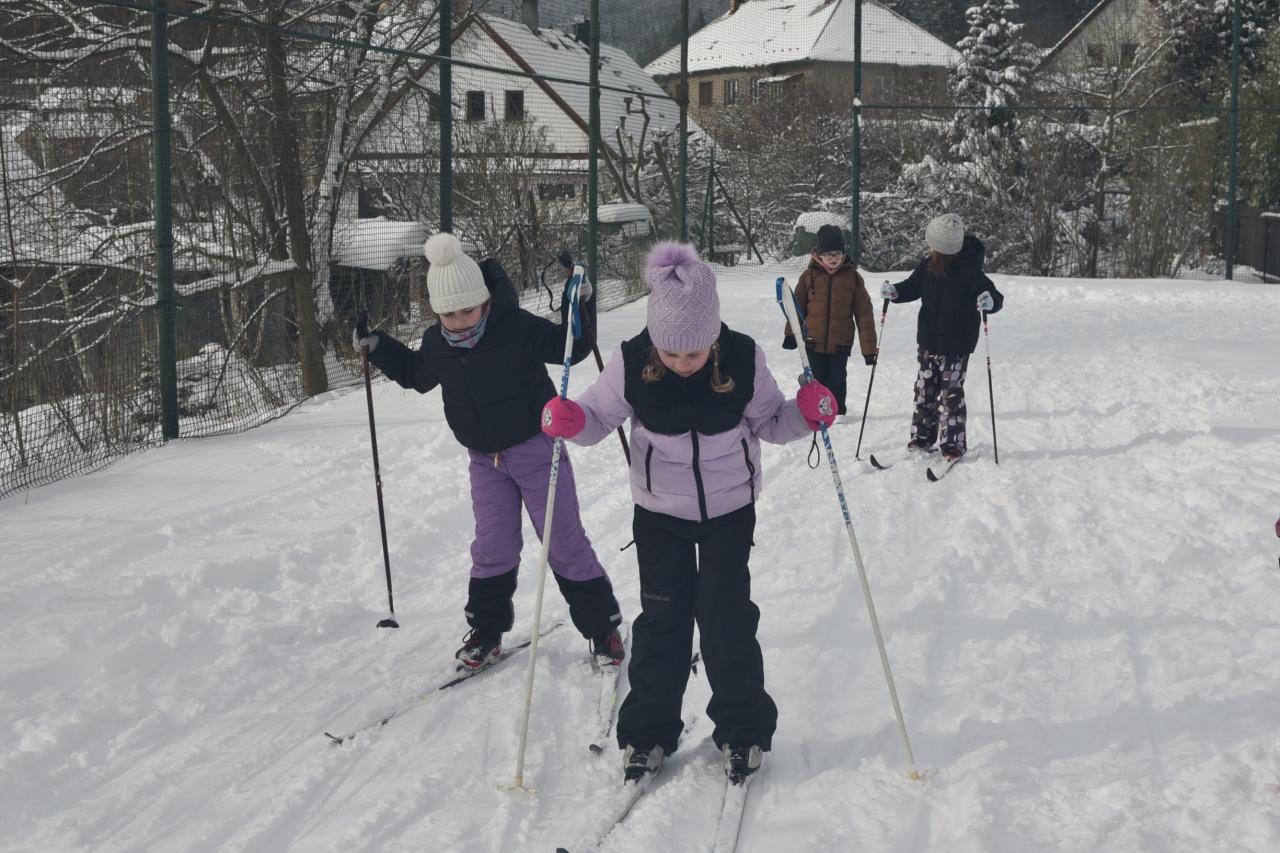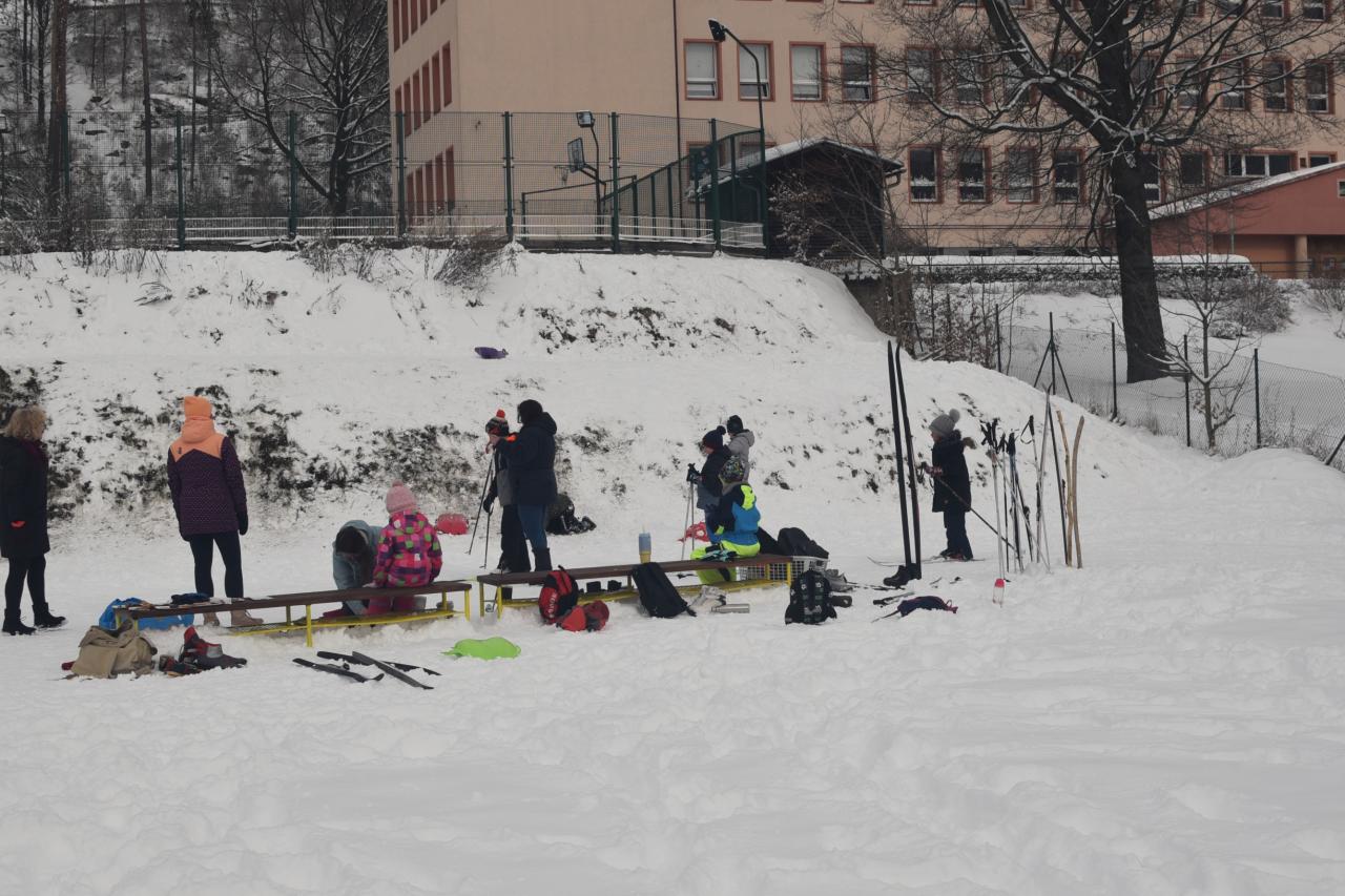 Dolní fotbalové hřiště se přeměnilo na šumavskou mrazovou kotlinu s centrálním ledovým iglú a dvěma běžkařskými ovály. Ty časně zrána vyšlapala na běžkách značky Salomon naše sportovní paní učitelka Martina Majerová.