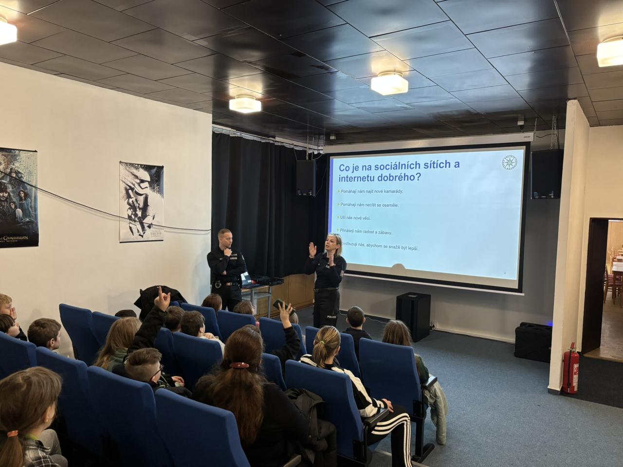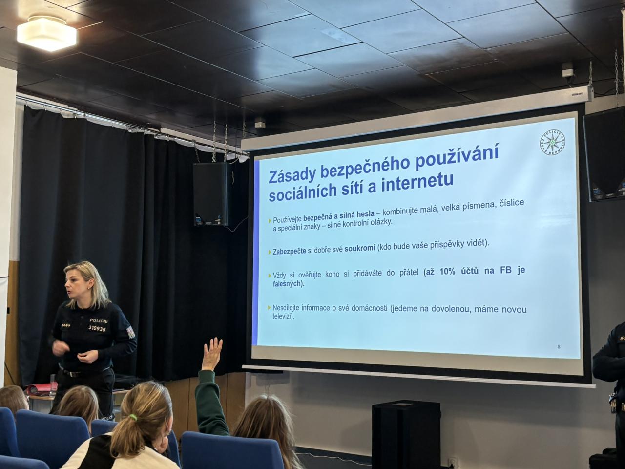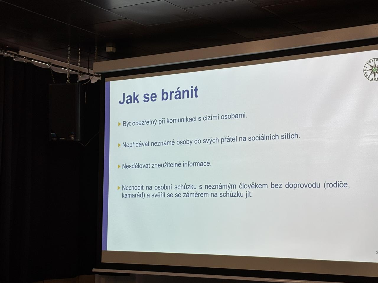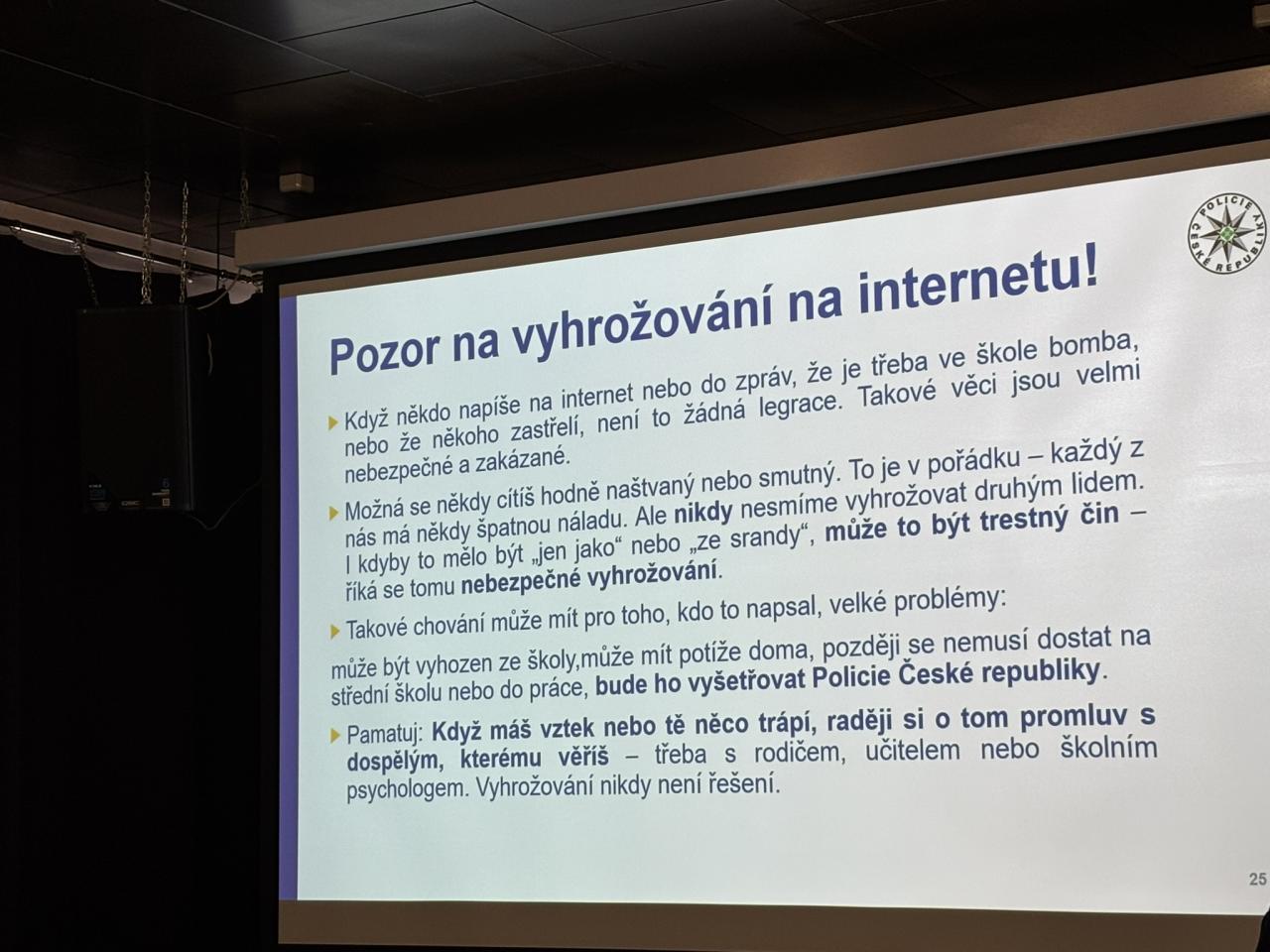 Policisté dětem srozumitelně vysvětlili zásady bezpečného používání internetu a sociálních sítí – jak si správně nastavit soukromí, jak si zabezpečit účet silným heslem, co je vhodné zveřejňovat a co by naopak na internetu nikdy sdílet neměly. Seznámily se také s tím, jak se projevuje kyberšikana, jak ji rozpoznat a jak se proti ní bránit. Dozvěděly se, co znamená pojem kybergrooming, jak probíhá a proč je důležité být obezřetný při komunikaci s neznámými lidmi. Nechyběla ani zmínka o vyhrožování na internetu a o tom, jak v takové situaci správně postupovat.