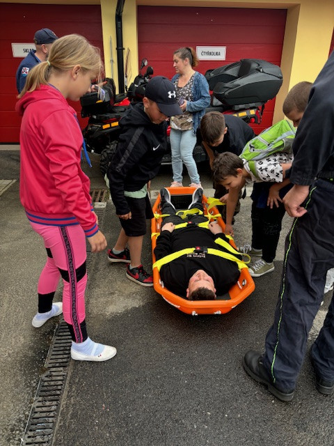 Jedním z dalších stanovišť byla i hasičárna, kde jsme si mimo jiné prohlédli vybavení hasičského auta i hasičárny a vyzkoušeli si nést raněného na nosítkách.