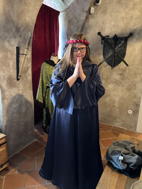 Rozdělili jsme se do tří skupin, abychom si v klidu mohli vše vyzkoušet. První část exkurze směřovala do alchymistické laboratoře v podzemí. Zde jsme si vyzkoušeli smíchat různé kapaliny, pozorovat jejich reakce, změnu barvy apod. Z podzemí vedly naše kroky dále do gotické a renesanční šatny, kde jsme měli k dispozici si vyzkoušet spoustu kostýmů z této doby. Vyzkoušeli jsme i oblečení mnichů a jeptišek. Další částí programu bylo Skriptorium - písařská dílna, kde jsme si zahráli na písaře. Husím brkem namočeným v inkoustu jsme si na papír napsali počáteční písmeno našeho jména. Nebylo to určitě nic jednoduchého tímto způsobem, kdy ještě neexistovala pera nebo propisky, opisovat knihy. V přilehlé dílně jsme si vyrobili a natiskli svůj vlastní pohled a záložku. Lektoři nás dále provedli místností s léčivými bylinami, vysvětlili nám jejich účinky na lidské zdraví a mohli jsme si vyrobit vlastní léčivý bylinkový olej. Výrobou oleje to ale nekončilo. Na řadu přišla i mořská koupelová sůl, kterou jsme si mohli obarvit podle svých představ, vybrat aroma a zabalit do dárkového balíčku. Na konci exkurze jsme ještě zavítali do Františkova zvěřince - herny s obrovským loutkovým divadlem, dřevěnými hračkami a hrami, meči apod. Tady jsme se vyřádili, zahráli si divadlo a zakončili náš výlet.