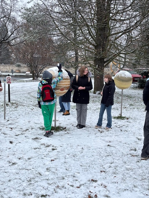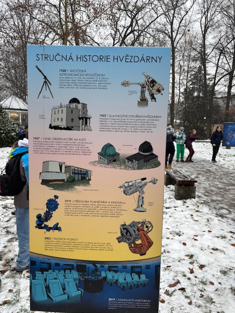 Ráno jsme z Loučovic vyrazili vlakem a po příjezdu do Českých Budějovic jsme zamířili rovnou do planetária, kde jsme měli zamluvený program. Protože jsme dorazili o něco dříve a od rána sněžilo, stalo se přirozeně to, co se stát muselo - v parku se spustila koulovačka. Alespoň jsme si zkrátili čas a pak jsme si již mohli přesunout dovnitř.