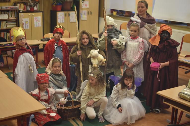 Nám třem se hvězda zjevila, která jak živa nebyla.Co ty, černej, stojíš vzadu, vystrkuješ na nás bradu?