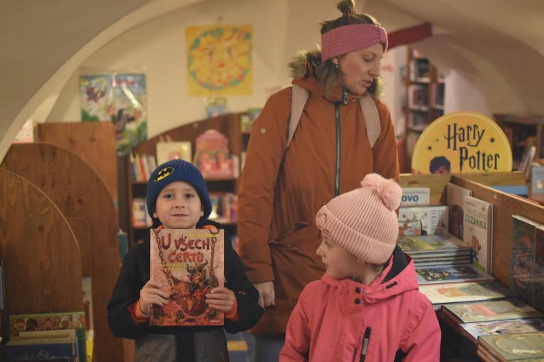 Po kostelních schodech scházíme do dveří našeho nejmilejšího knihkupectví "Expedice". Jdeme si prohlédnout letošní knižní nadílku pro nejmladší čtenáře. Výběr je tu veliký, spousta knížek s nádhernými ilustracemi a velkými kouzelnými písmenky.