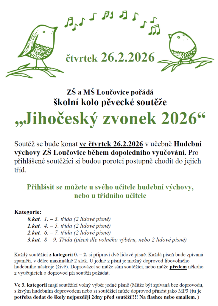 Školní kolo pěvecké soutěže Jihočeský zvonek. Podrobnosti v příloze.