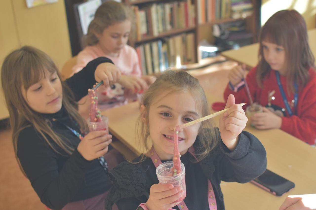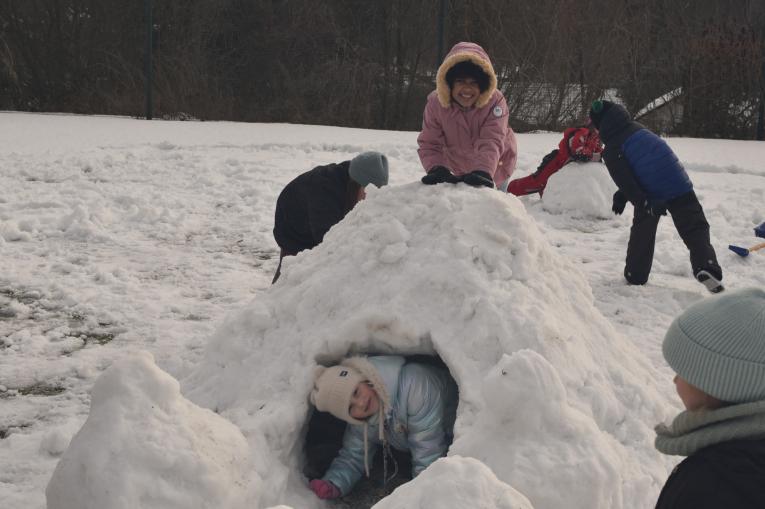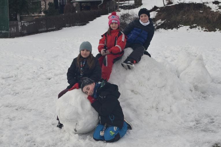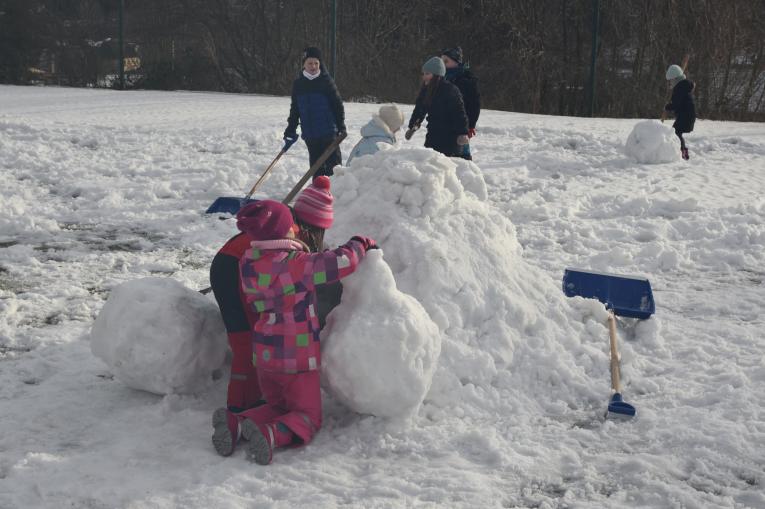 Další týden nám paní učitelka Anička přinesla celou bednu nejrůznějších lahví, krabiček a sáčků. Budeme vyrábět tolik oblíbený "sliz" - tentokrát v kuličkovém provedení. Mícháme, přitvrzujeme, přibarvujeme, hněteme - výsledkem je neuvěřitelná struktura lesního, žabího a posvícenského slizu. To je radosti.A potom to iglú - vezme se 5 až 6 lopat, 7 až 8 malých "eskymaček a eskymáků" a na dolním loučovickém hřišti se navrství několik metráků těžkého sněhu zn. "Šumavan". Vydlabat jednu malou místnost, nakoulet vstupní obří koule, na jedné straně želví hlava, na druhé pak medvědí strážníci. Každý musí vyzkoušet, jak nám iglú pasuje. No, přeci báječně - vždyť jsme se pořádně všichni zapotili...